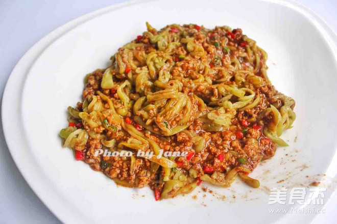6.下锅煮,再加300g水、马拉盏、老抽、盐,煮至肉熟,勾芡后淋在茄丝上,或茄丝下锅拌匀后盛起