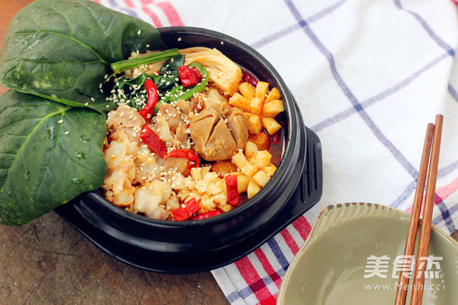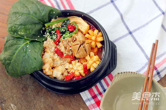 羊肉片50克 丸子200克 鸭血1块 菠菜3棵 面筋1块 海带适量 金针菇适量