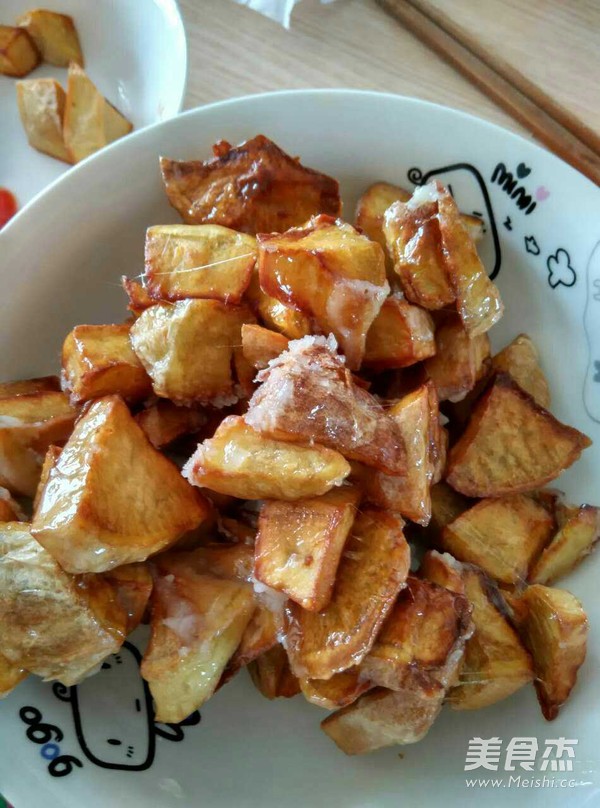 4.锅中倒入少许油,油开把白糖和水混合倒入锅中,熬成黄色冒泡放入地瓜,翻炒几下出锅
