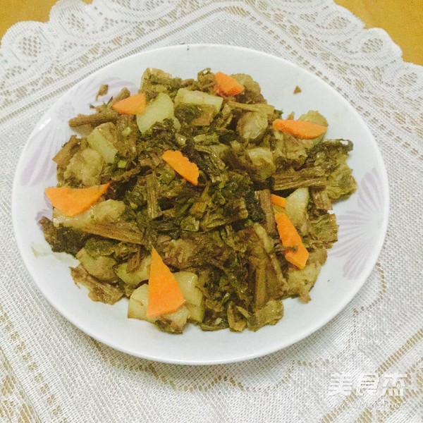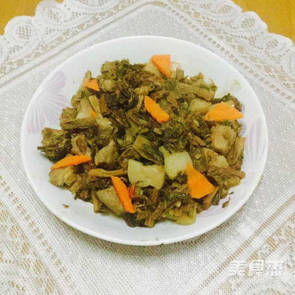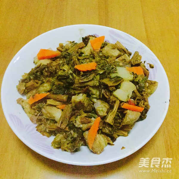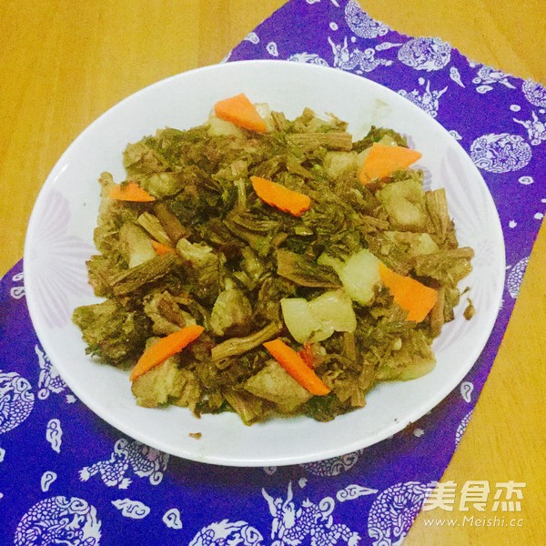 1.猪腩肉切好,用油盐、蚝油腌好,菜干用清水浸泡1小时左右,浸泡至软