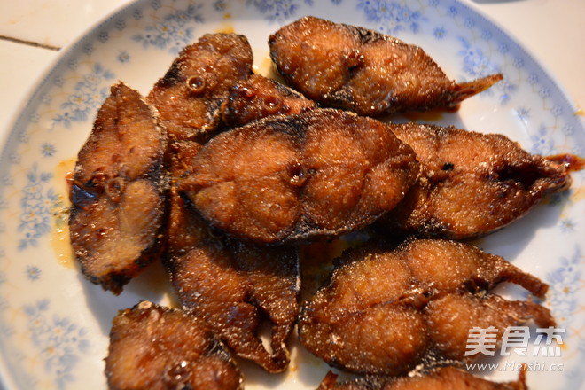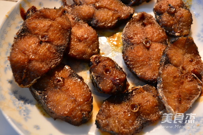 2.油没过鲅鱼,炸至金黄色,这一步的作用就是把鲅鱼的肉质炸到硬,不易松散的状态。