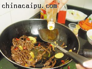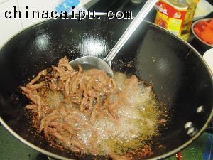 4、牛肉丝倒入热油中炸制时,要不时翻搅让肉丝分开,使其不粘连,炸至干身微焦即成。