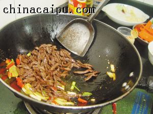 4 烧热2汤匙油,以小火炒香姜片、葱白和指天椒,加入1汤匙辣椒粉、1汤匙花椒粉和2汤匙清水炒匀,倒入牛肉丝拌炒1分钟。