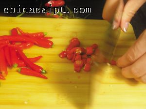 2 指天椒去蒂,切成圈状;姜切片,葱切段,分开葱白和葱青。