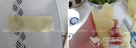 5.煎饼裁成长条形,卷成卷,放入苦菊装盘,淋上点剩下的调味汁即可