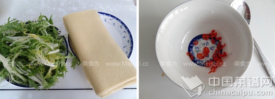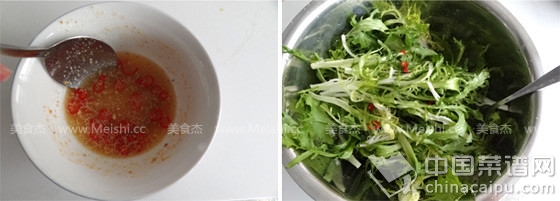 4.用少许纯净水融化拌匀,洗干净苦菊,淋干水分,放入调好的汁搅拌均匀