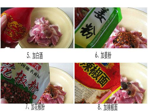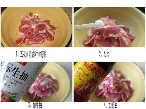 2、五花肉切5mm厚片,加各种调料腌渍10分钟。