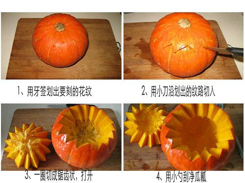 1、南瓜洗净,用牙签划出锯齿纹,用小刀沿花纹扎透,分开盖子和南瓜盅,用小勺挖去瓜瓤,刮净内壁备用。